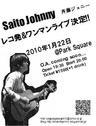 年明け2010年1月22日、仙台Park Squareにて なんと私ジョニーのワンマンライブが決定しました!!!! 我ながらしょっぱいフライヤーです(笑) やはり無謀だった・・・・ なんて言われないように頑張ります。 皆さん是非遊びに来てください!!! 当日はバンドバージョンでの演奏もあります。 メンバーにはまさかのあの人やあんな人が・・・・ ・・・・必聴であります。 そしてもう一つ、同じ日に CDも発売しちゃいます!!!!!! こちらは10月に東京でレコーディングした バンドバージョンの音源に加え、弾語りの曲も あわせて収録した内容で価格は500円!!!! 基本ライブ会場でのみ販売しますので 是非ライブを見に来て、手にとってください! --------------------------------------------------------------- 12月のライブスケジュールです。 12/8(tue)@Macana open:18:00 start: 18:30 ticket 1200/1500(+1drink) w/Kansas,アストロボーイズ,etc.... 12/17(thu)@Birdland 詳細未定 w/Azumi,片山ケンタロー,Plastic Soul, 12/18(Fri)@Ha' Penny Blidge 毎月第三金曜のレギュラー出演 ライブチャージはなし www.hotpepper.jp/strJ000101119/ フォトギャラリーに自分の写真がありますです。 12/28.29(mon,tue)@長町Ripple 東北大学軽音学部アステロイズ定期演奏会 ticket: Free!!!!! 12月もがんばりますよー よろしくおねがいします!!!!